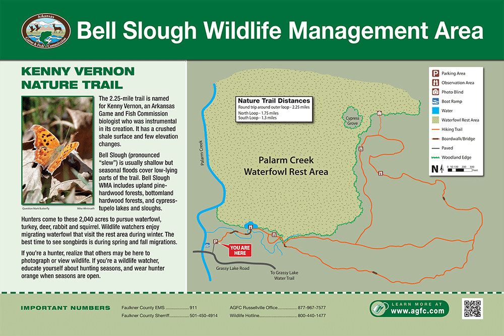 The 2.25-mile trail is named for Kenny Vernon, an Arkansas Game and Fish Commission biologist who was instrumental in its creation. It has a crushed shale surface and few elevation changes.