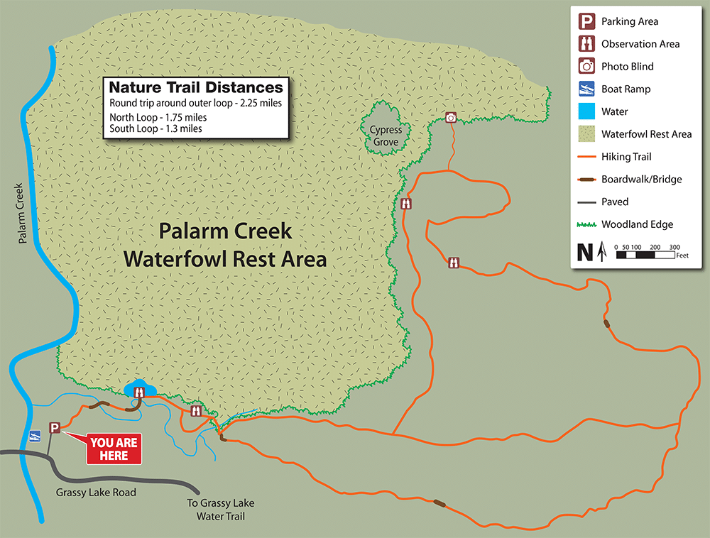 - Continue on Interstate Drive past Gibson Bridge Road and over Palarm Creek, to Bell Slough Wildlife Management Area (1.5 miles total). Turn left into the parking area.