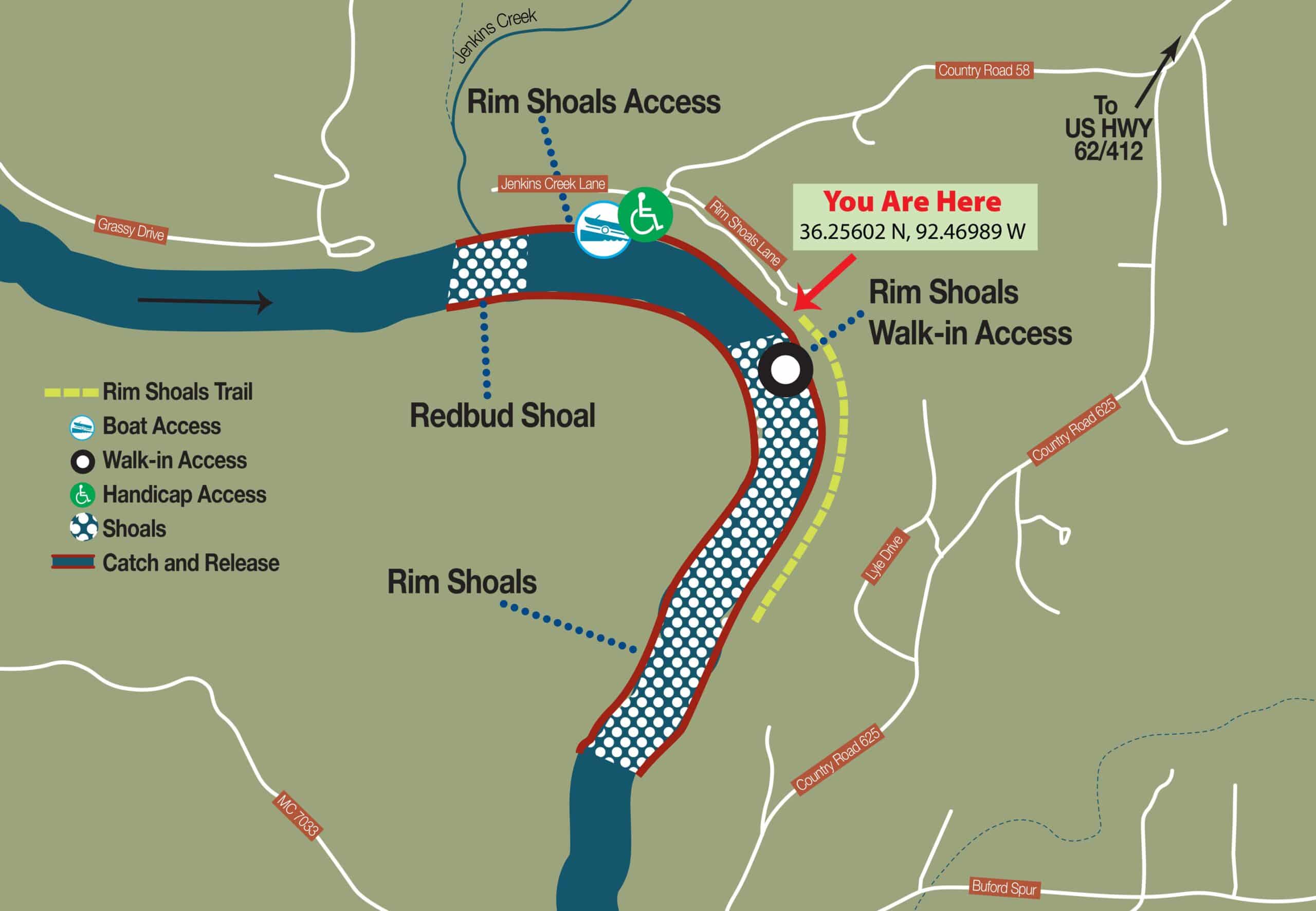 Anglers have been walking the wooded shoreline at Rim Shoals for many years. Gary Flippin, owner of Rim Shoals Resort and a former railroad engineer, was concerned that anglers walking along the railroad tracks didn’t have a safe exit when the river rose quickly. Flippin talked to property owner Hugh McClain about donating the land to the Arkansas Game and Fish Commission, which McClain did in 2019. Donations from McClain and Trout Unlimited, plus a grant from the Frank Graham Memorial Endowment, were used to build the trail.