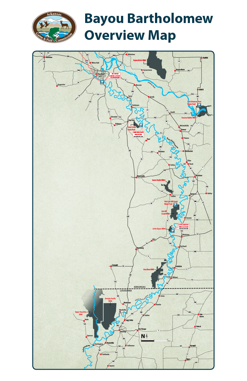 - Little Bayou Wildlife Management Area Access: Paddle 4.5 miles downstream to the Arkansas Highway 82 Access.
