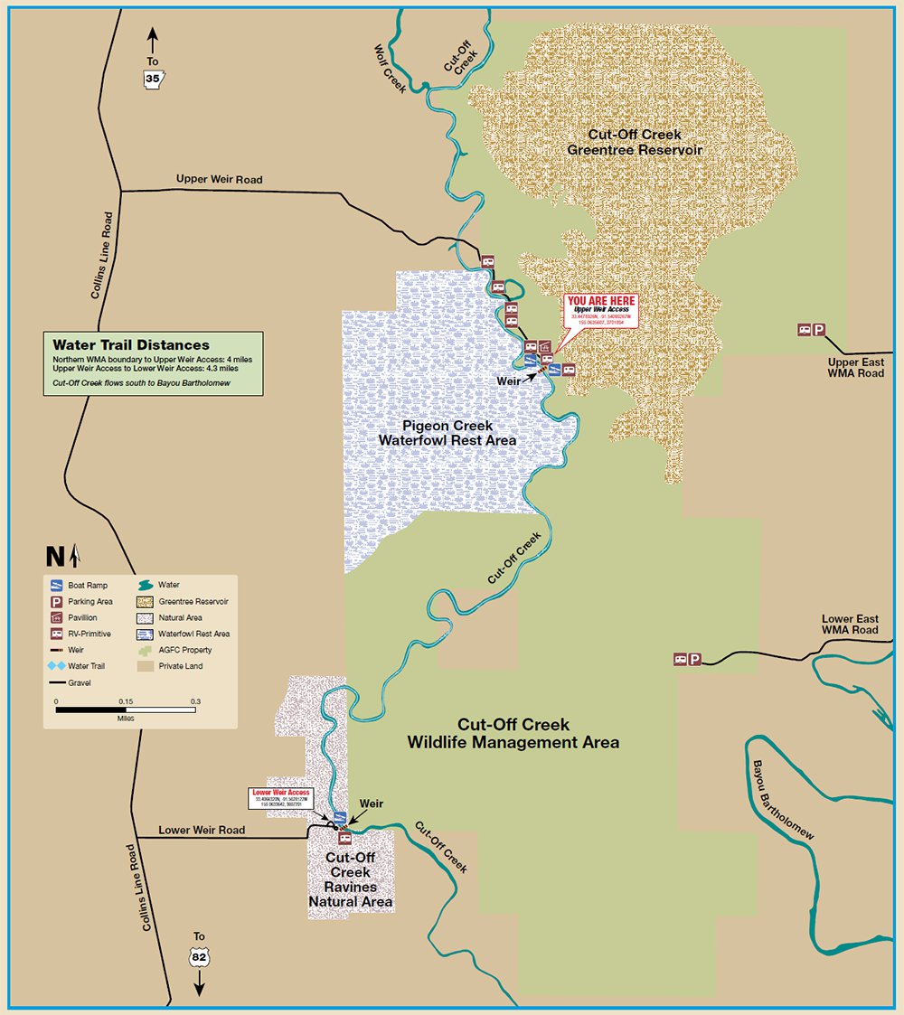 A weir (dam) blocks boat travel on the creek between the two boat ramps at Upper Weir Access (see map). Another dam a few yards below Lower Weir Access also blocks boat travel; the creek is overgrown below that point. Plan your trip accordingly.