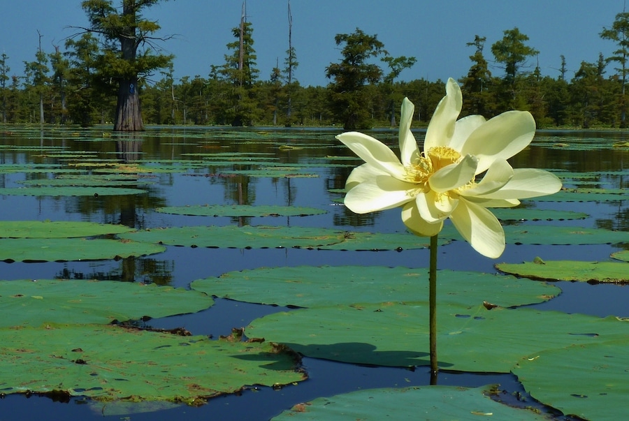 Bluegill, redear and largemouth bass frequent cypress tree trunks, and lily and lotus pads. Flathead and channel catfish hang out in deep holes by day and prowl the shallows at night.