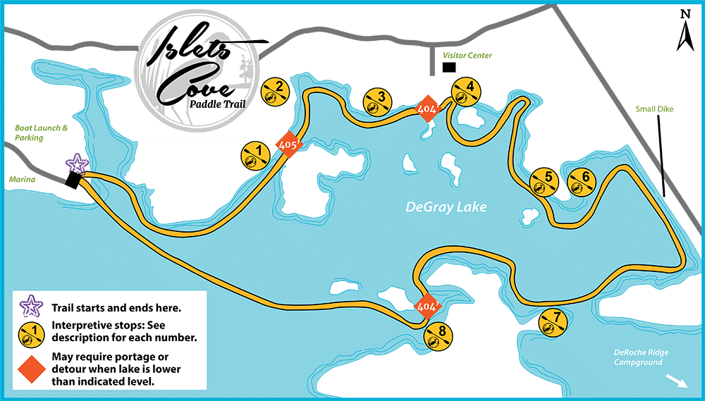 For an optimal experience, follow the yellow signs posted along the shoreline that are indicated on the map. Rent kayaks, canoes or stand-up paddleboards at the DeGray Lake Resort State Park marina. Visit degray.com.