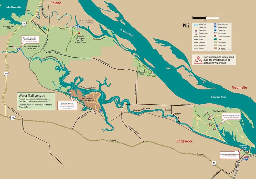 Pinnacle Mountain State Park Access to Two Rivers Park Access: 8.2 river miles. The Little Maumelle River flows east to the Arkansas River.