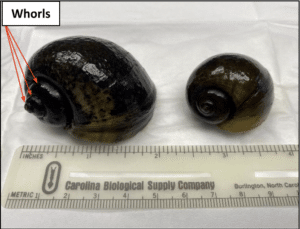 - Key features: (see pictures below): large snail (adults 2 to 6 inches tall) with golden-yellow to dark brown shell that has 3 to 4 whorls. Flap called an operculum can close shell opening