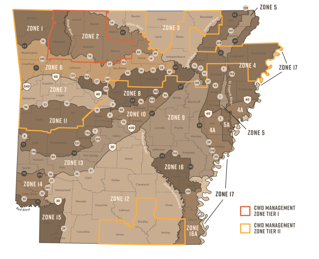 - In Cleburne, Crawford, Franklin, Independence, Johnson, Madison, Newton, Pope, Searcy, Stone, Van Buren and Washington counties, CWD regulations apply.