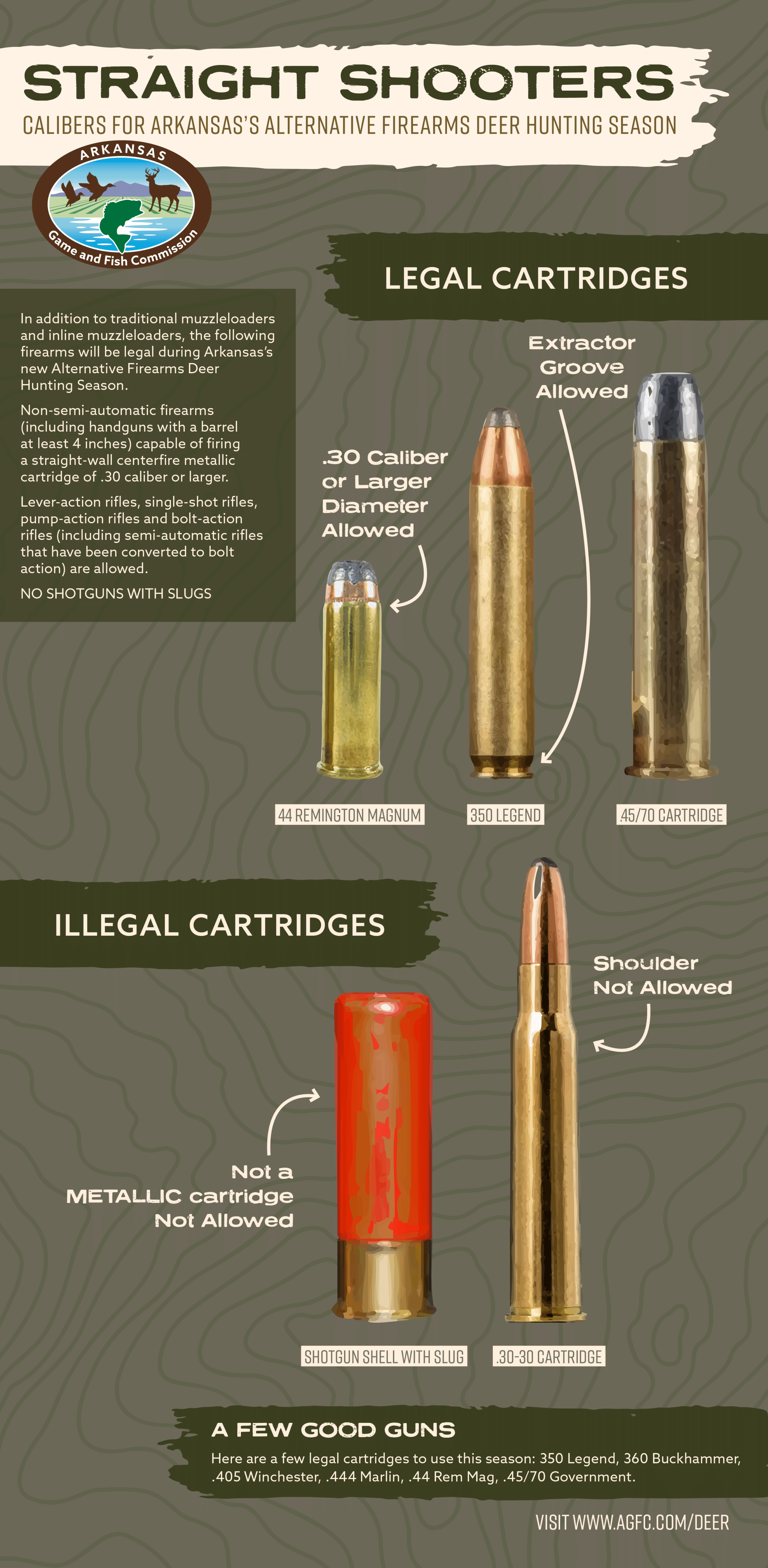NOTE: The AGFC has approved for modern gun deer season the use of large-bore air rifles that meet certain standards. The large-bore air rifle must be at least .40-caliber, shoot a single, expandable slug, produce at least 400 feet/pounds of energy at the muzzle, and be charged from an external tank. Large-bore air rifles are not legal for harvesting bear or elk.