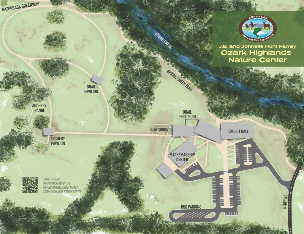 Welcome to the J.B. and Johnelle Hunt Family Ozark Highlands Nature Center. This 32,000 square foot facility on over 61 acres is the newest place to learn about the natural world and outdoor recreation in Northwest Arkansas. We are located at 3400 North 40th Street, Springdale, AR 72762.