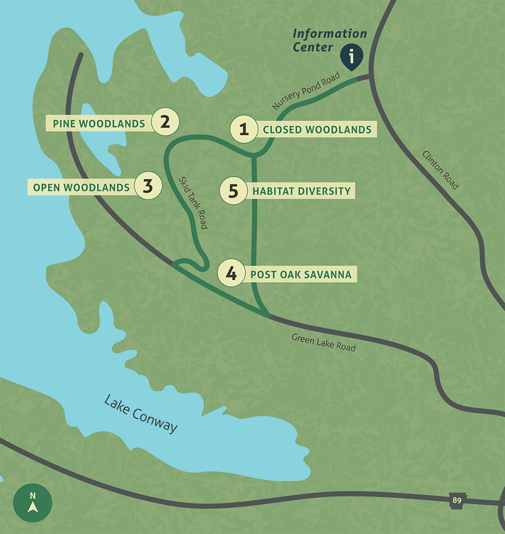 The natural force of fire is an important part of the recipe for our native wildlife and the habitats they require. The AGFC’s resource managers and conservation partners join forces to use fire for the habitat it helps provide across the state. This upland area demonstrates decades of management promoting oak and pine woodlands and savannas once common across the state. The auto tour will vary by season – plants are dormant in winter and wildflowers bloom in spring. A winter visitor may find burned areas, but healthy growth will begin each spring.